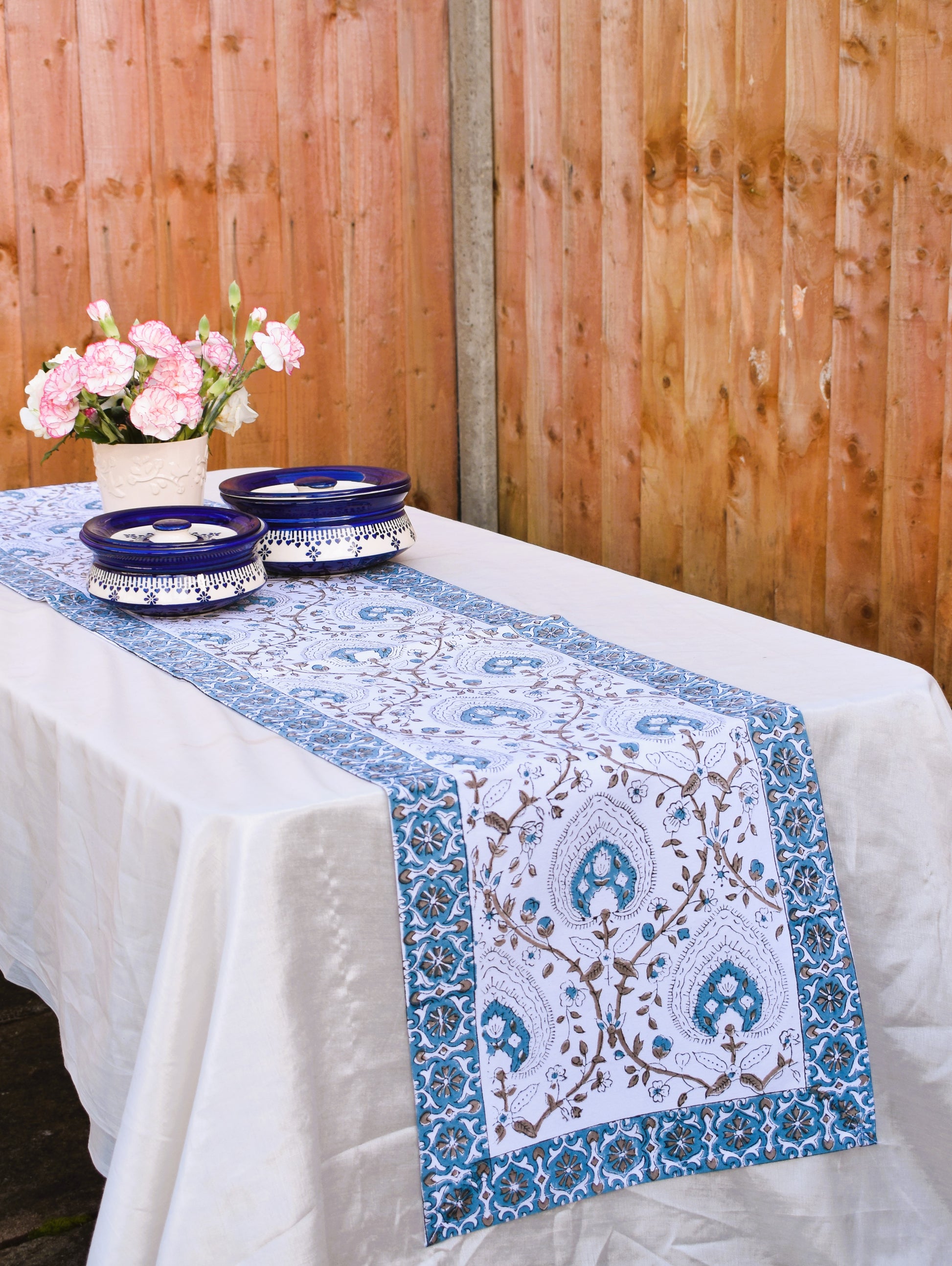 Add some Jaipur charm to your dining table with this beautiful Blue floral Block Print Table Runner. Made from high-quality cotton and vegetable dye colours, this table runner features a stunning floral design in shades of blue. The durable construction ensures it can withstand regular use, while the generous size fits most standard tables. Perfect for hosting summer parties or everyday use, this table runner adds a touch of elegance to any meal.