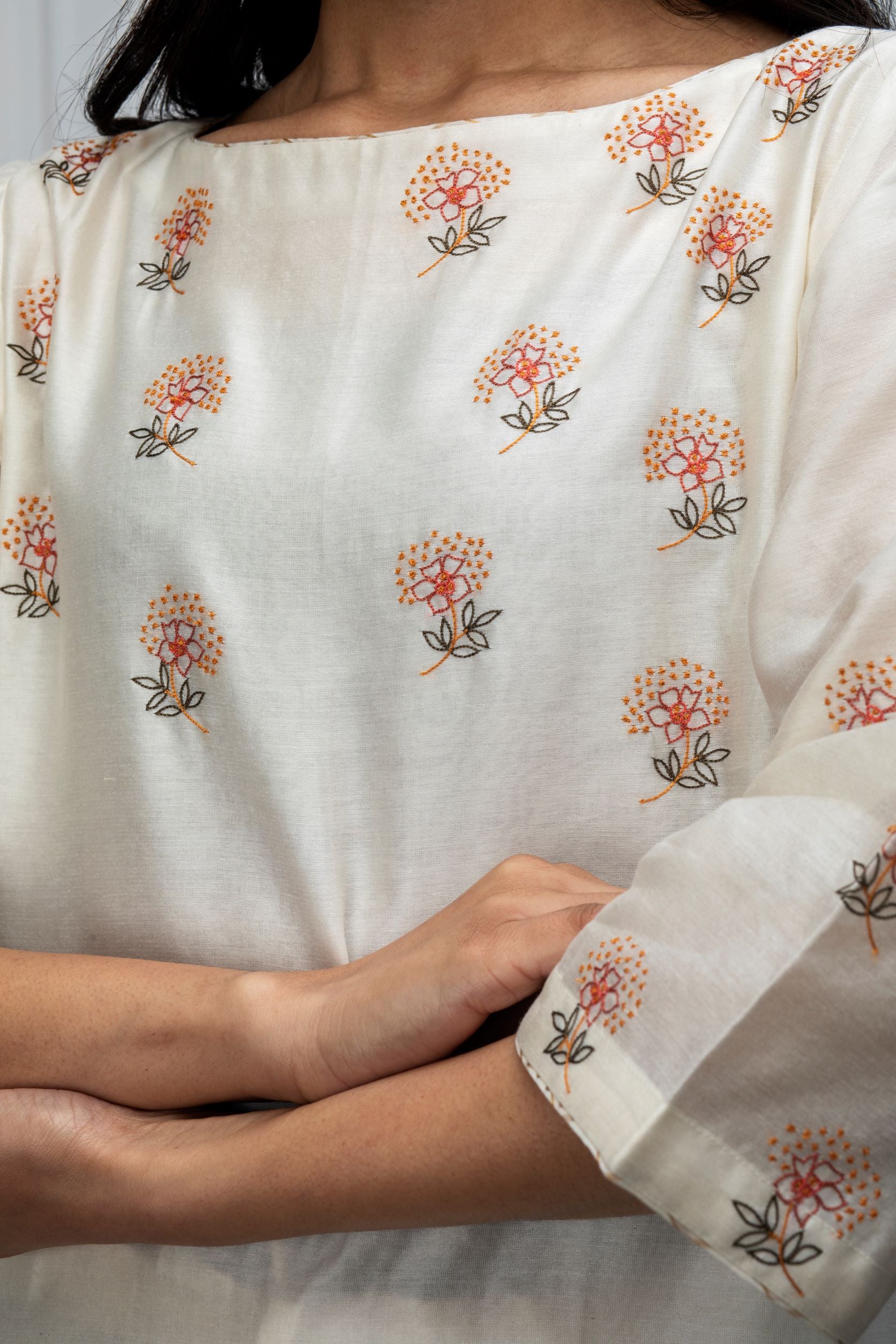 Off White hand embroidered Chanderi kurta with attached cotton lining underneath.