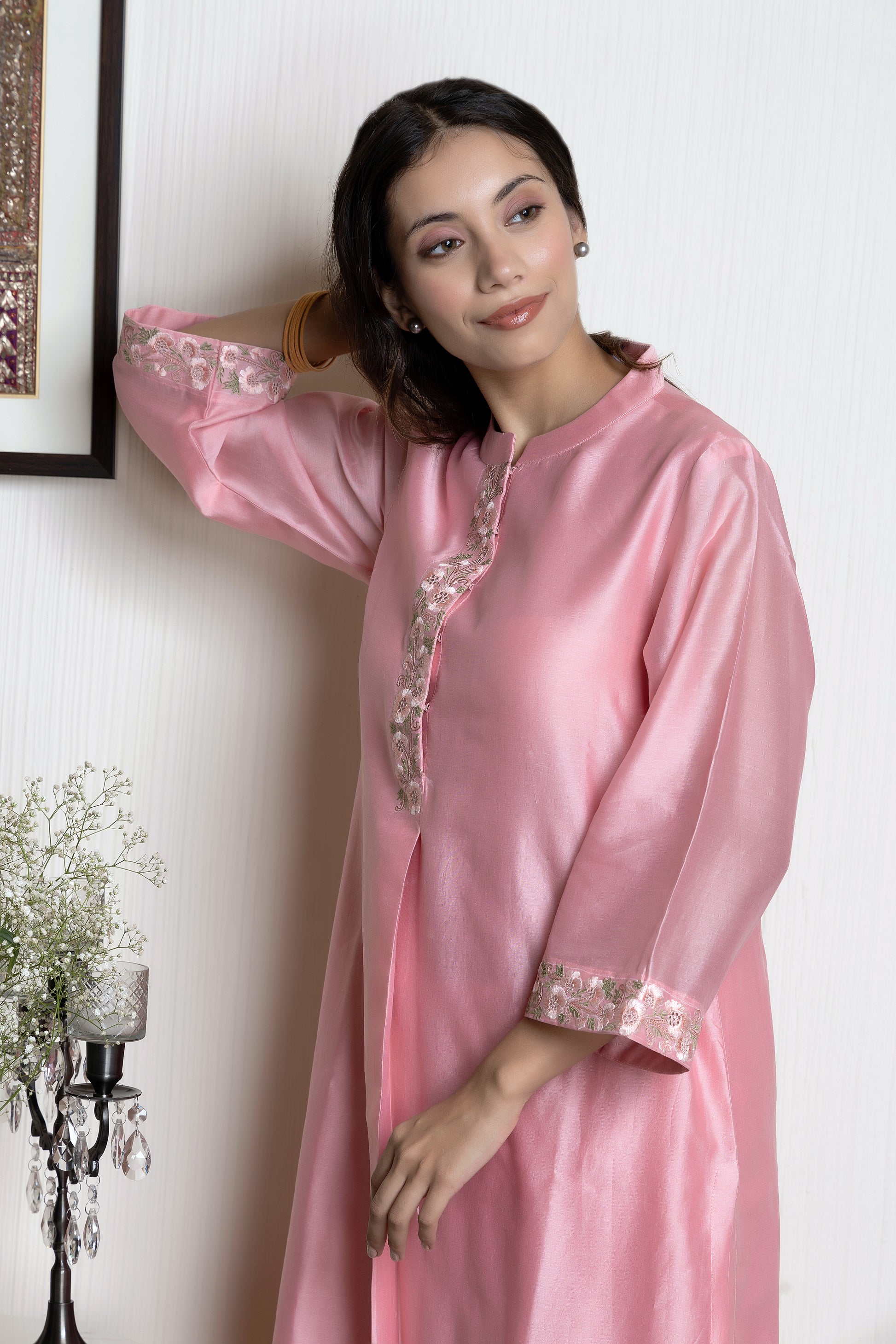 Product Name : Pink chanderi collared embroidered kurta paired with Chanderi pants